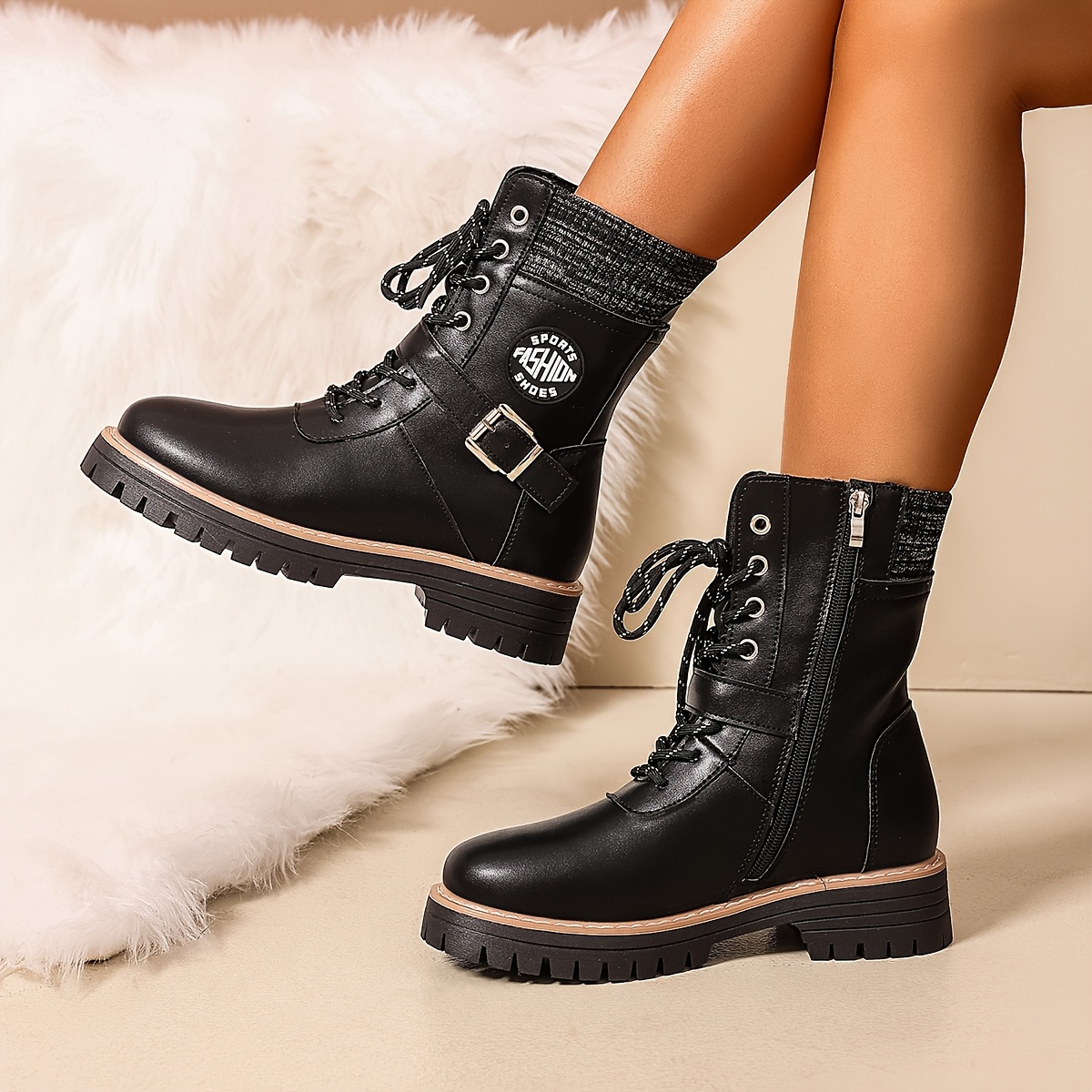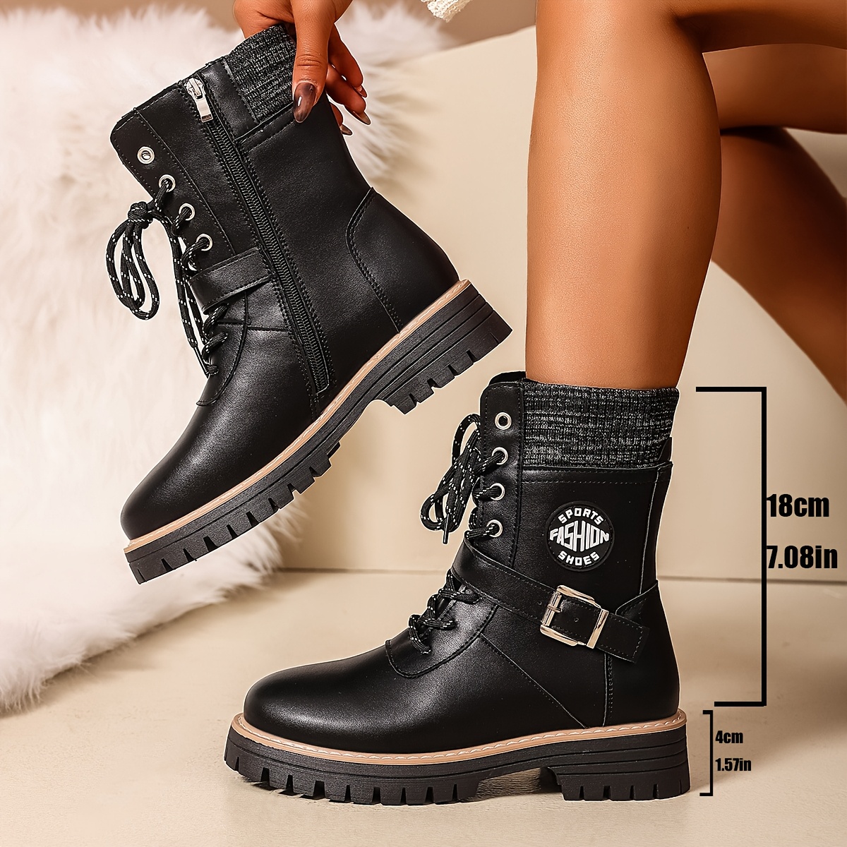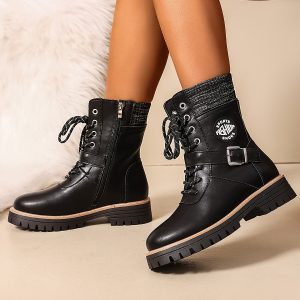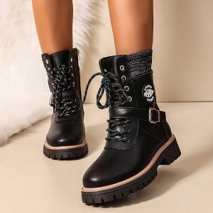 071-18 Black PU Women’s Ankle Boots, Suitable for 11 Festive Occasions, Lace-Up Round Toe Casual Sneakers with Synthetic Cover Upper and Fabric Lining, All-Season Wear, Fashionable Street Style, Ideal Gift