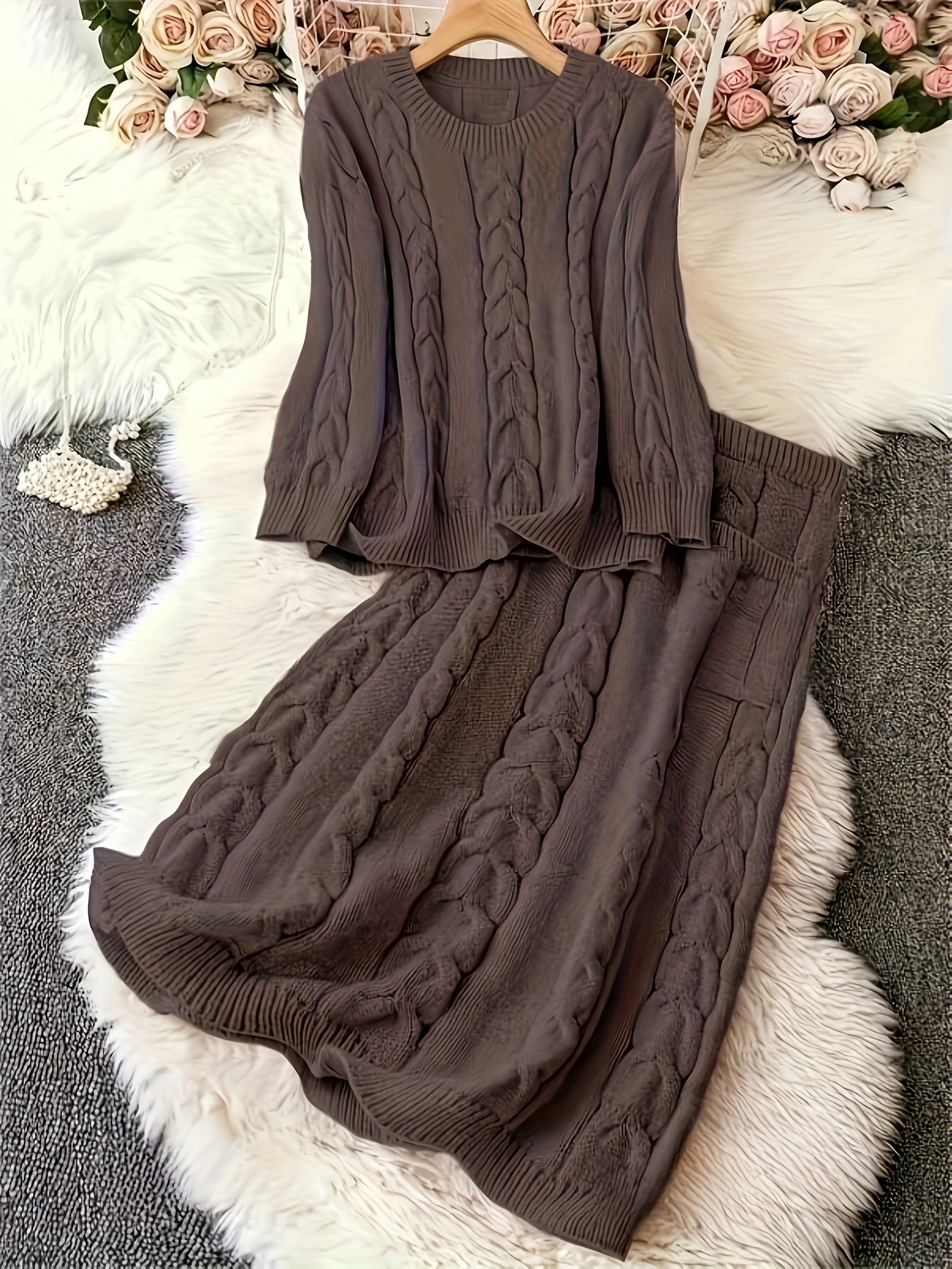 - 2024 Autumn And Winter New Women’S Twisted Rope Solid Color Casual Versatile Loose Cable Knit Round Neck Long Sleeve Top + Solid Color Cable Knit A-Line Skirt Two-Piece Set