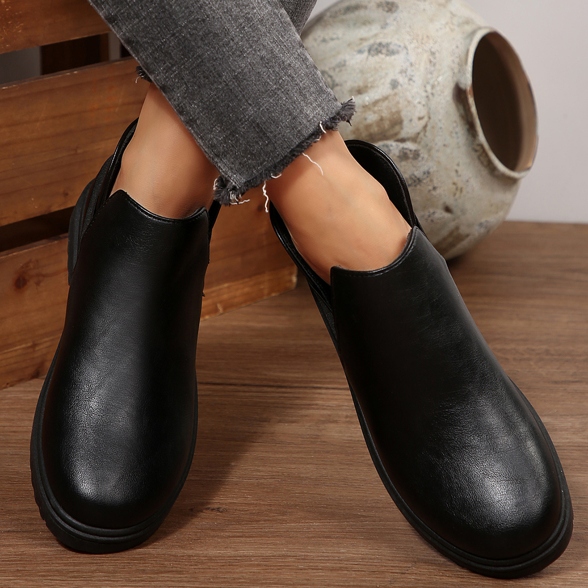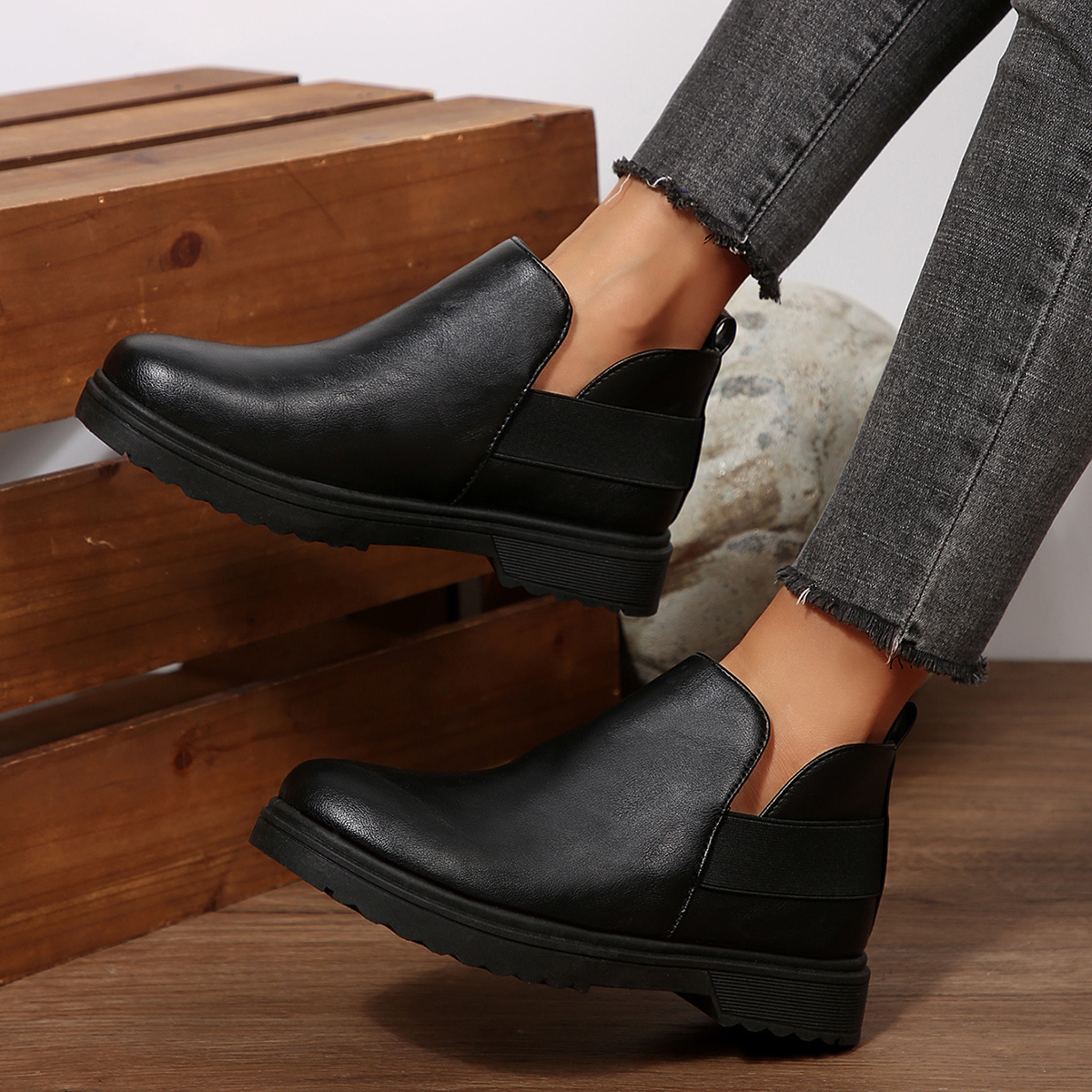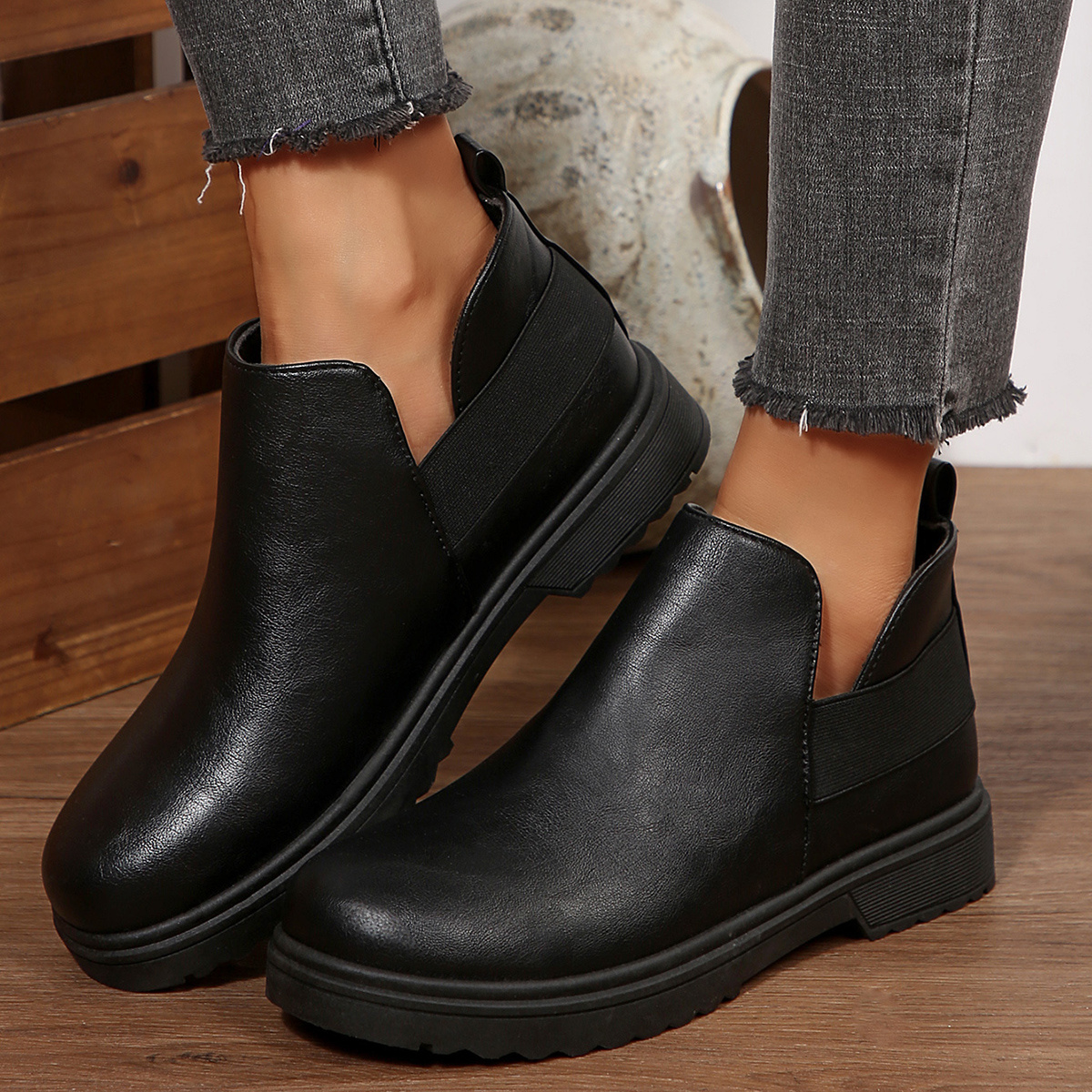- Black PU Ankle Boots Comfortable Women’s Black PU Ankle Boots | Round Toe, Thick Sole, Elastic Back Design, All-Season Versatile Casual & Dressy Short Boots, Fabric Lined Interior