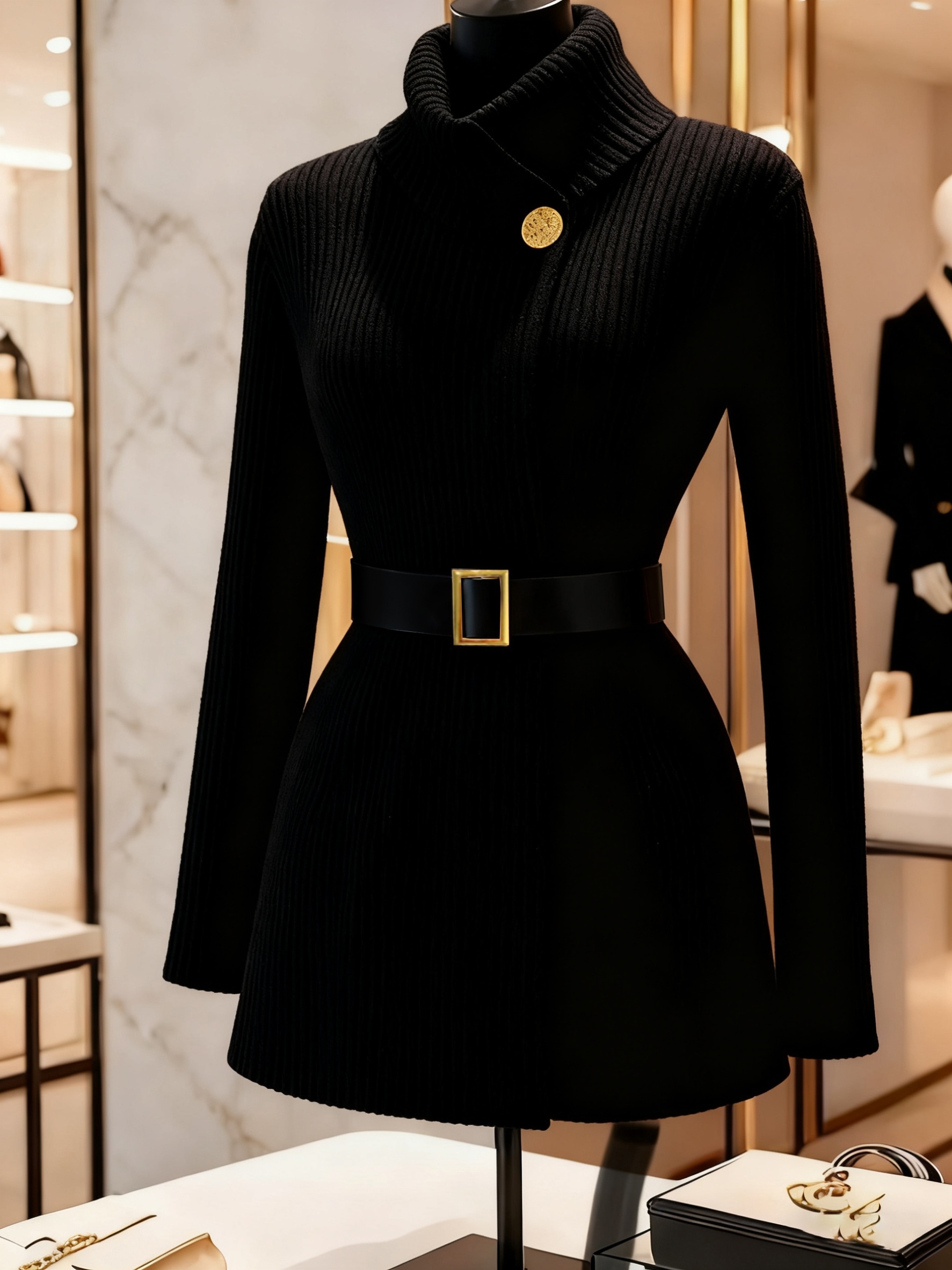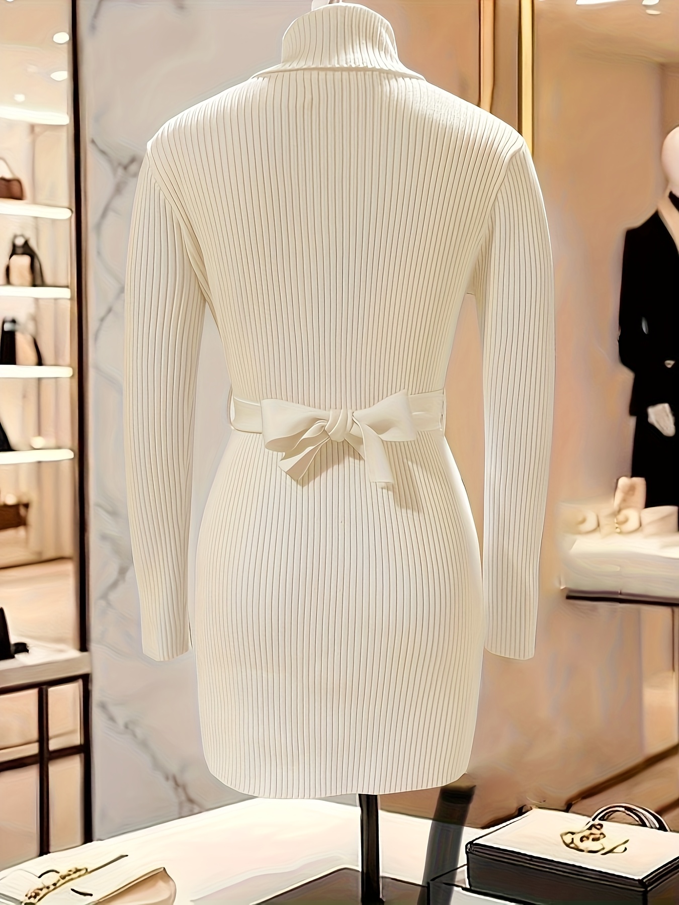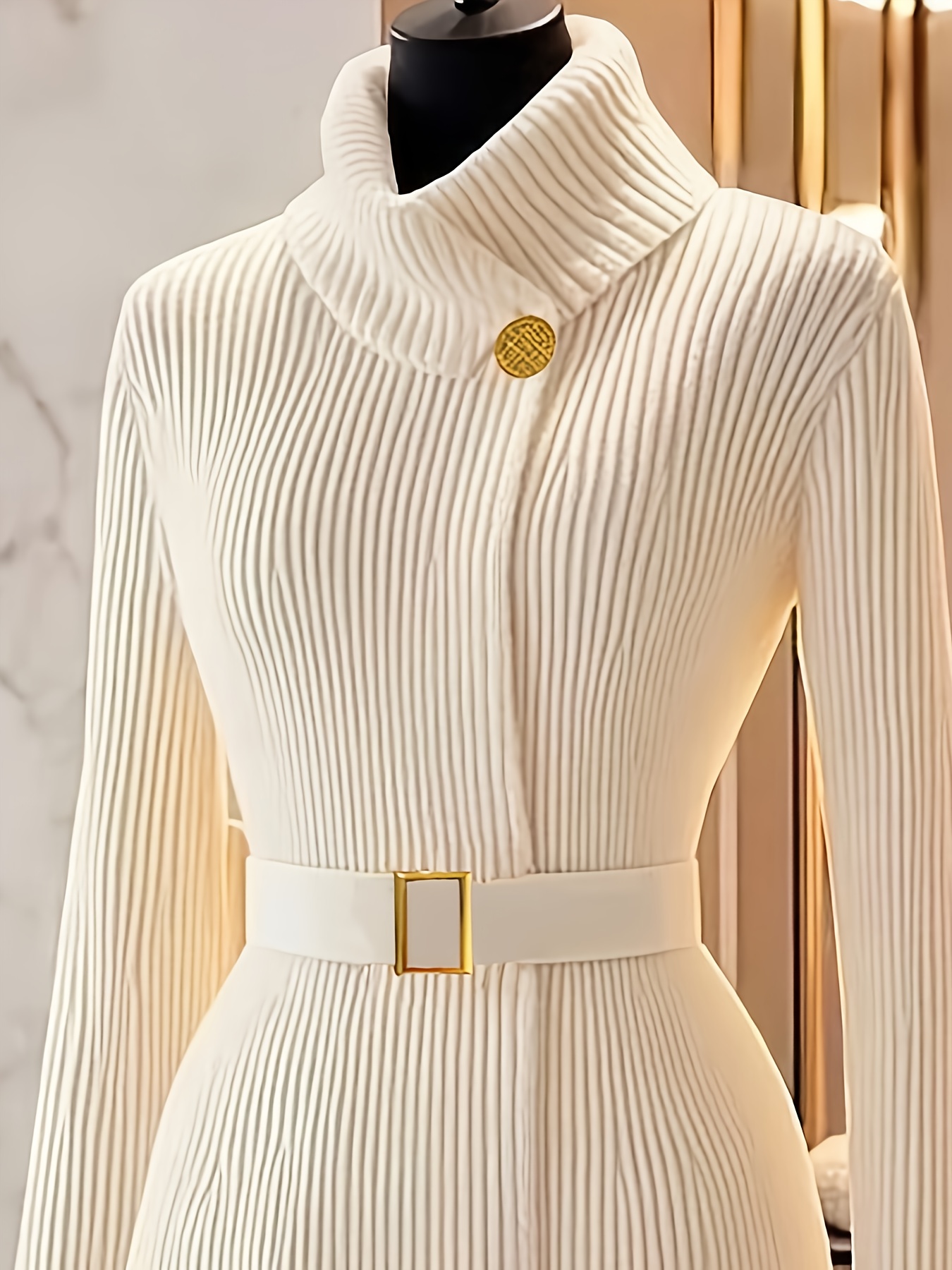 Elegant, High Neck Sweater Elegant, Sophisticated Women’s High Neck Sweater – Chic Belted Waist, Stretch Sweater for Formal Events, Office & Everyday – Machine Washable Winter Sweater Coat in Elegant Whiteu002FNeutral Tones, Autumn Fashion, Ribbed Texture, Professional Women