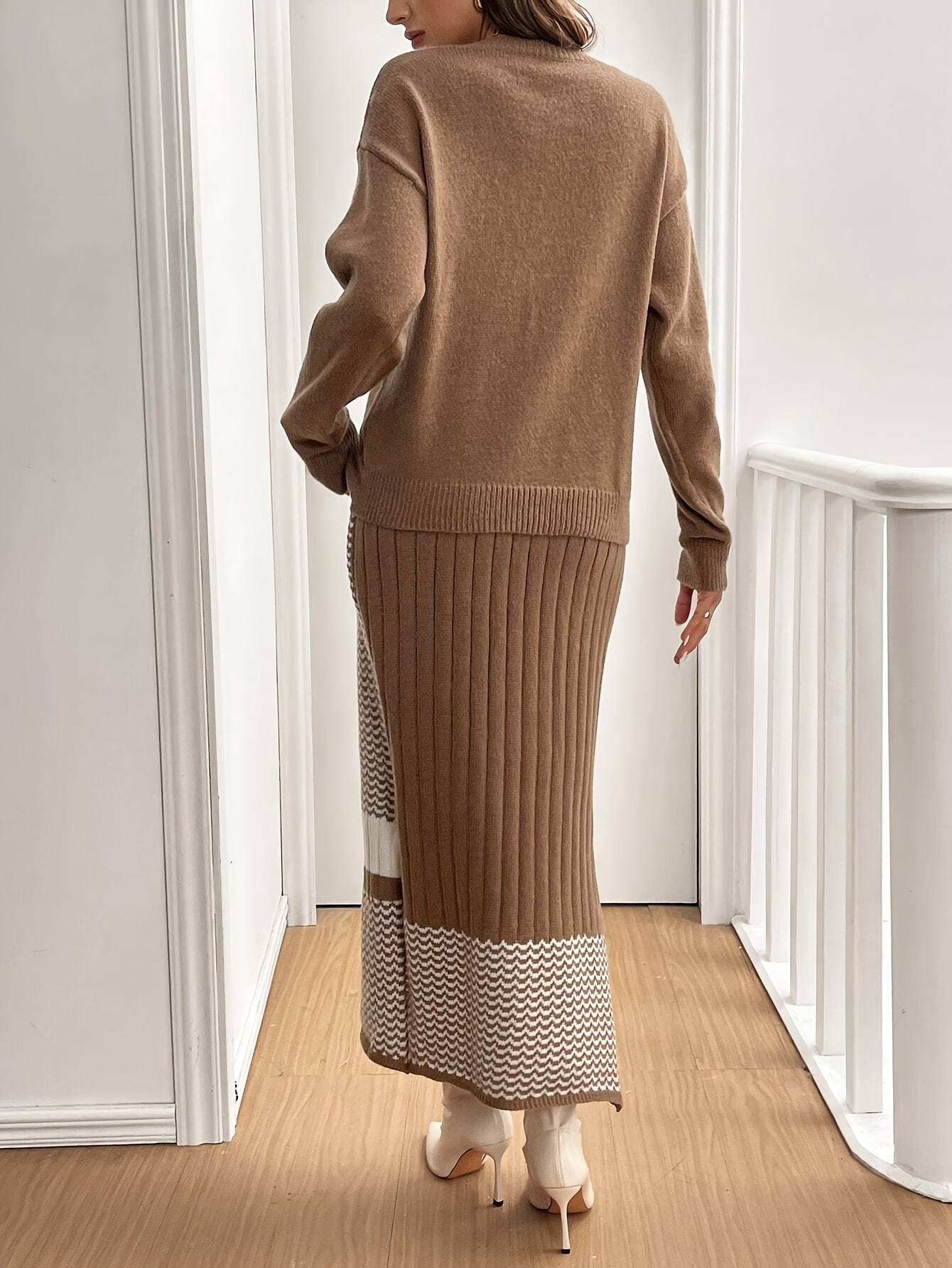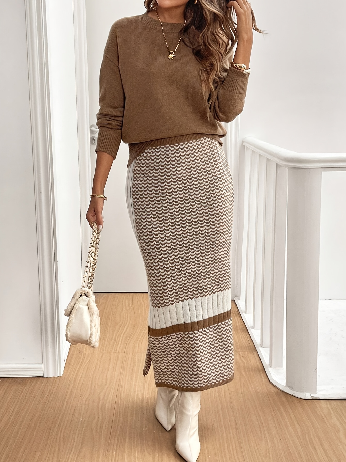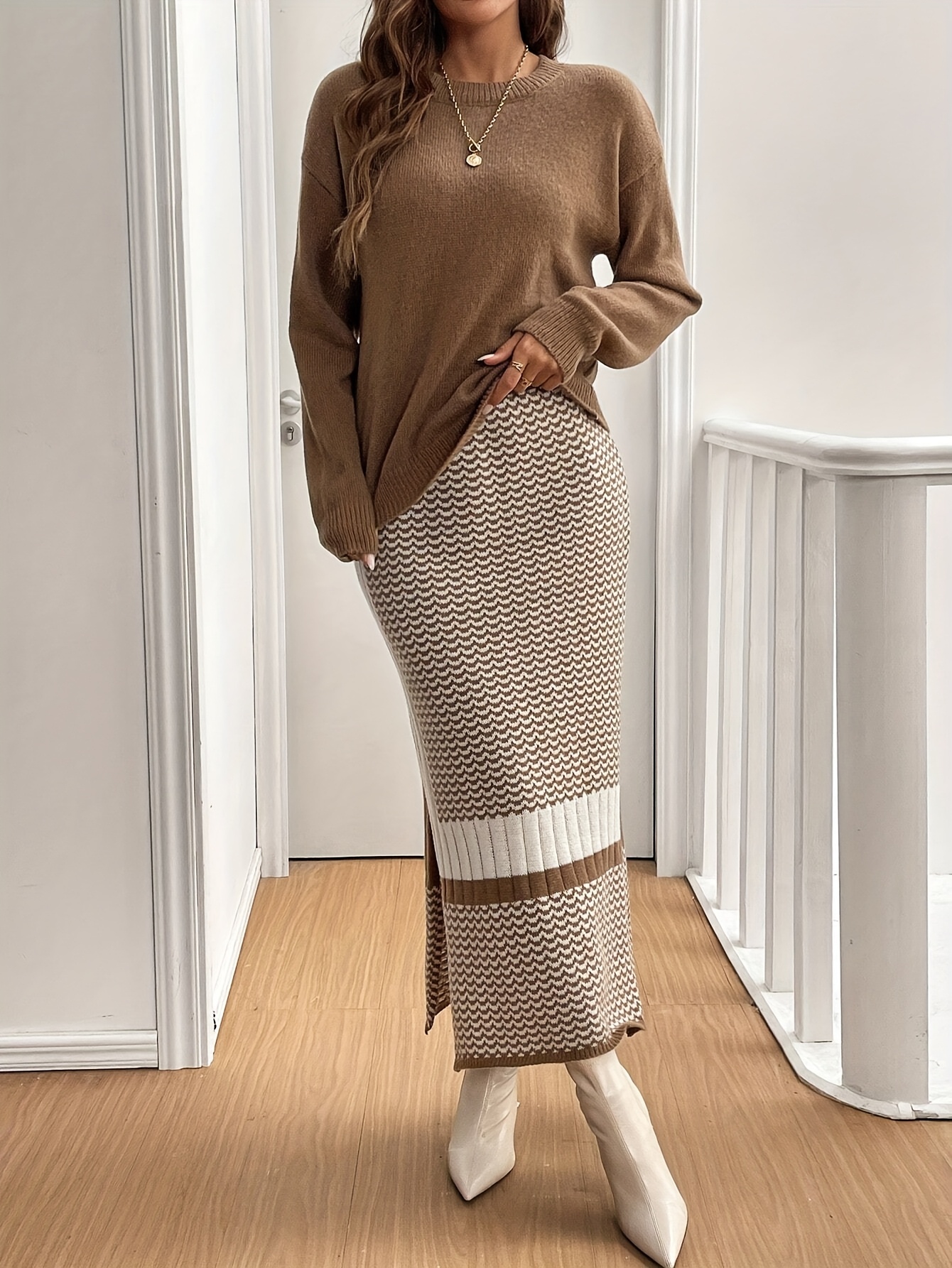 New Fashionable Two-Piece Set for Women: Round Neck Long Sleeve Solid Color Pullover with Long Stripes and Slit Skirt, Versatile Commuteu002FDate Outfit NNN