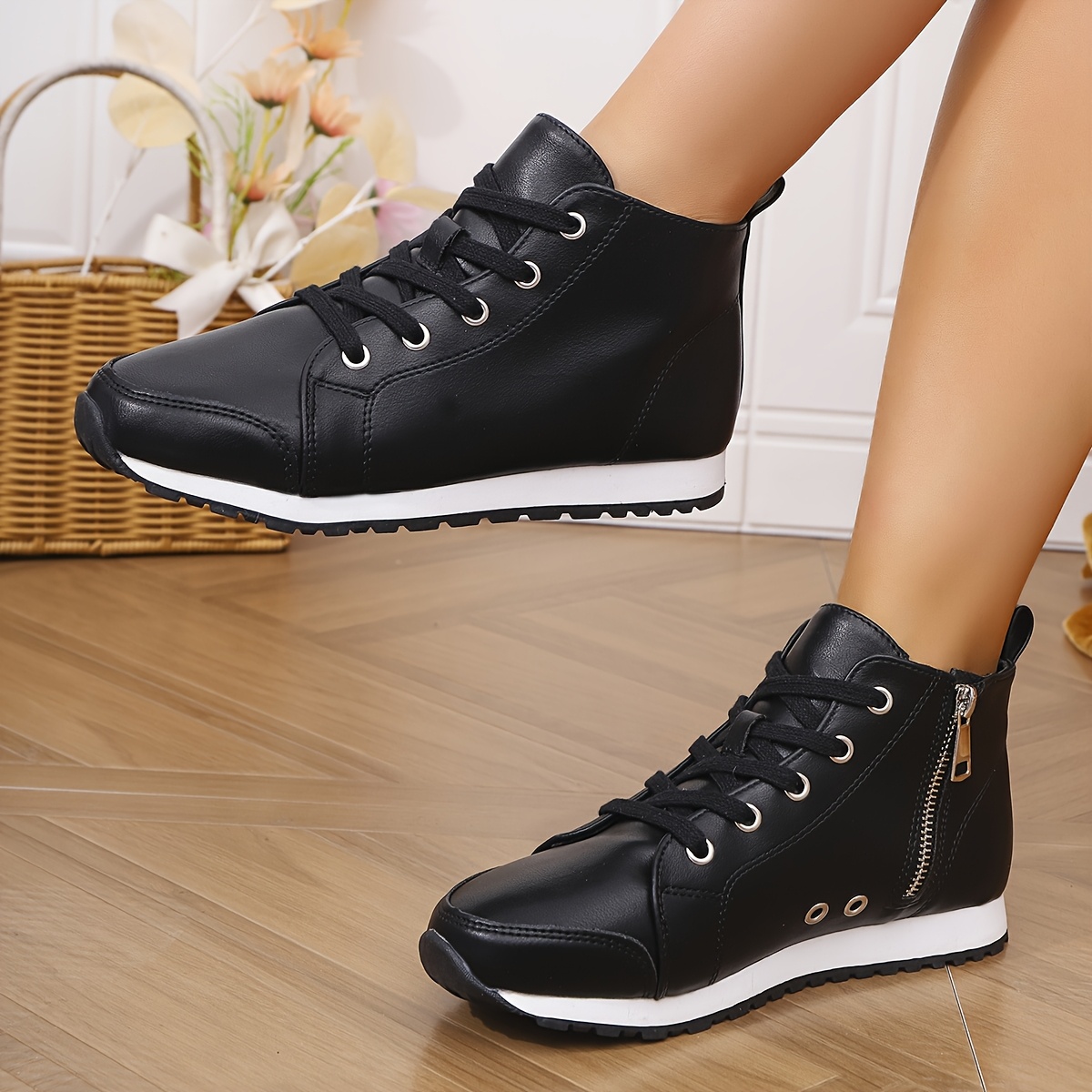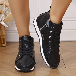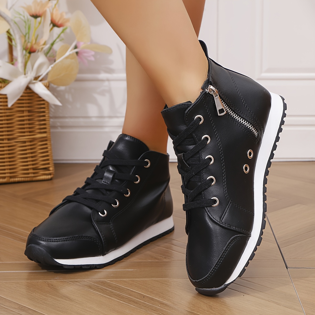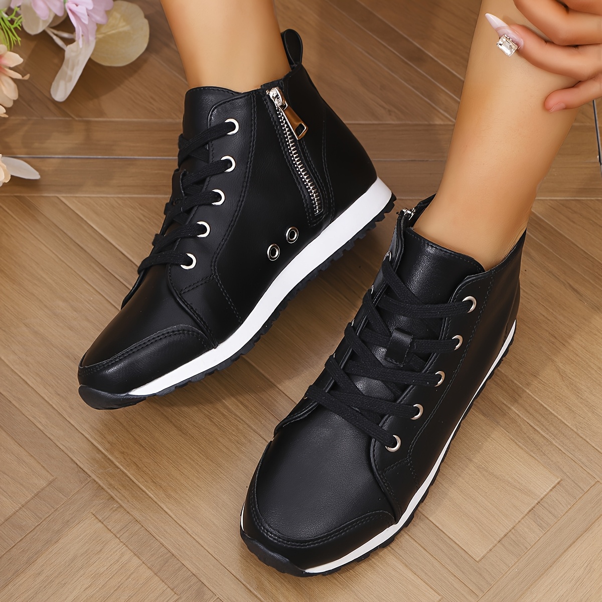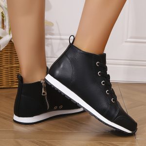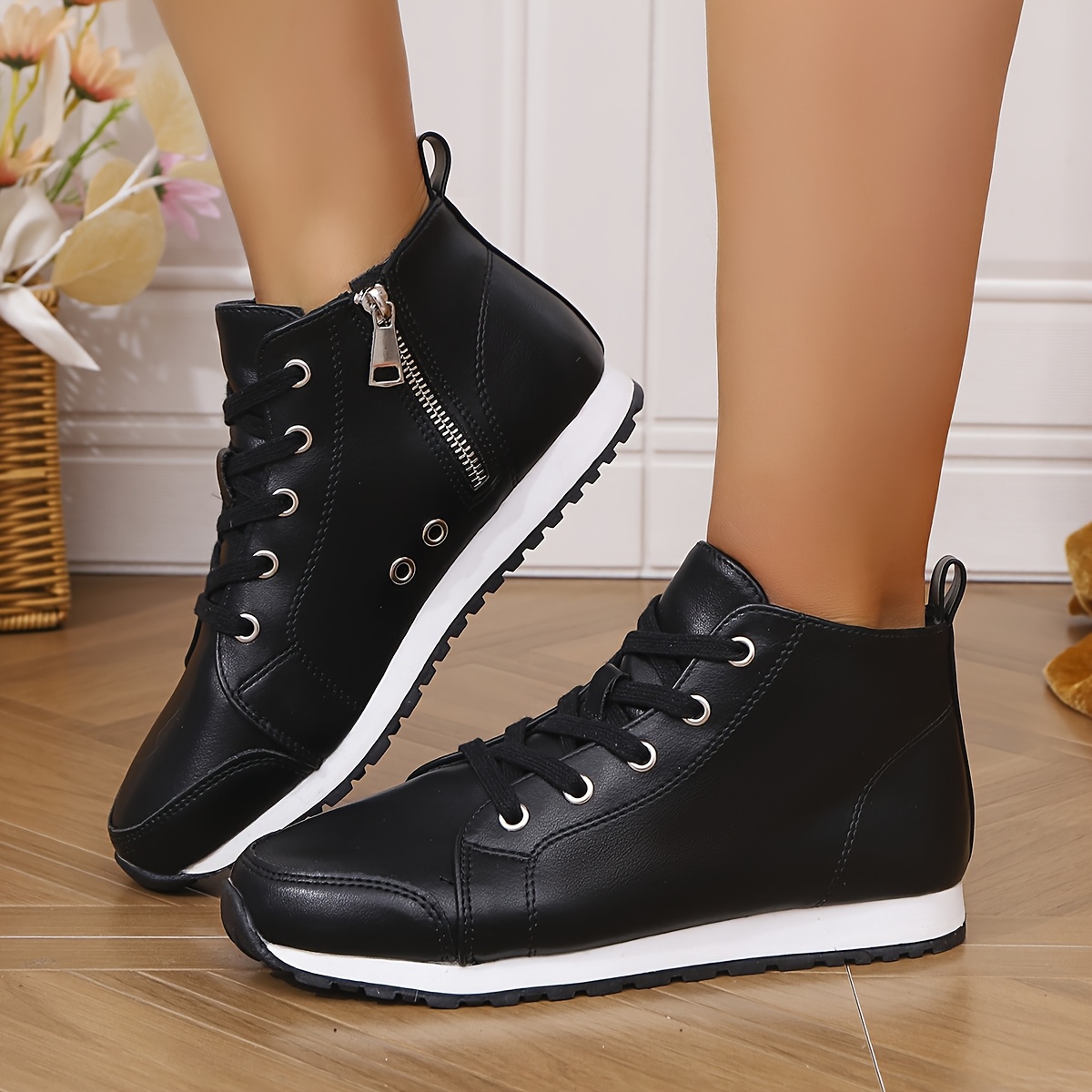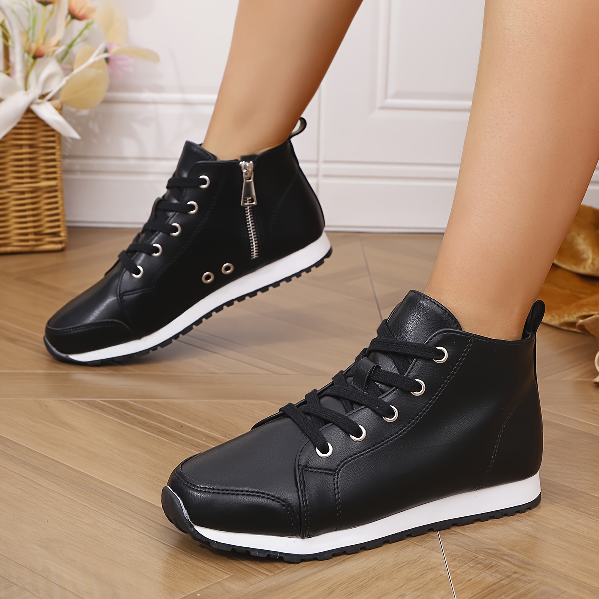 Black Single Zipper Ankle Boots for Women, Suitable for 11 Festivals, Lace-Up Round Toe Casual Sneakers with Faux Cover Fabric and Insole, Perfect for All Seasons, Stylish Street Style, Ideal Gift, Boot, Ankle Boot, Sneaker, Lace Ankle Boot, Boot For Women Ankle Sneaker, Warm Marine Boot For Women For Winter