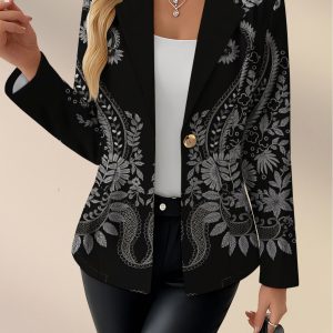 Women’s Elegant Floral Print Blazer, Long Sleeve Button-Up Jacket with X-Line Silhouette & Geometric Pattern, Fallu002FWinter Outerwear for Office, Parties, Casual Events, Women’s Fashion Coat