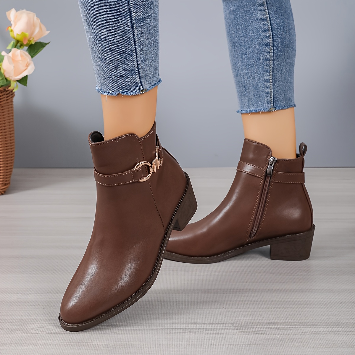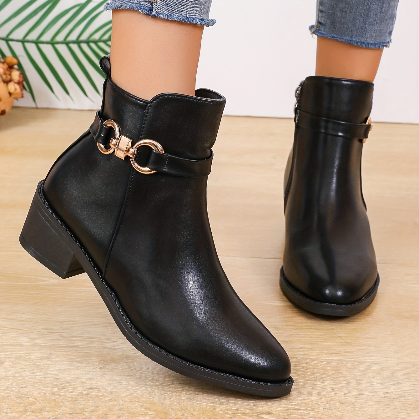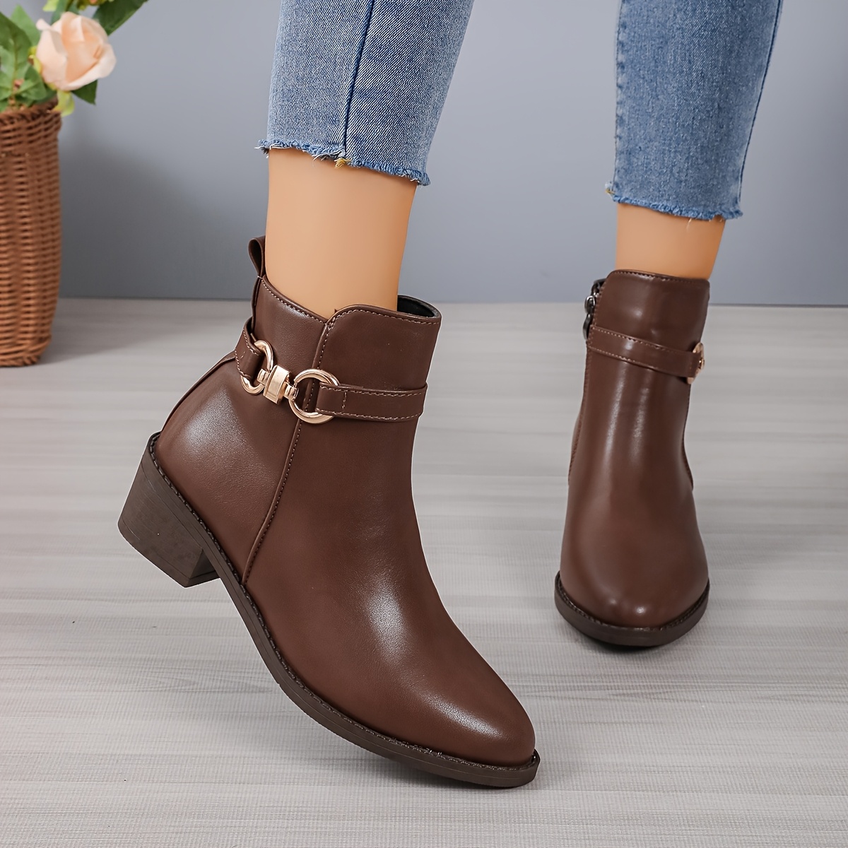 - Women’S Low-Heel Pointed Toe Ankle Boots with Golden Buckle Strap – Faux Cover, Chunky Heel, Zipper Closure, Versatile for Casual & Formal Outfits, Formal Footwear, Sleek Boot Design, Durable Rubber Sole