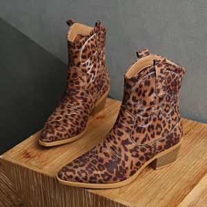 Women’s Western Cowboy Boots with Leopard Print – Round Toe Pull-On Ankle Boots with Heart Buckle & Chunky Heel, Brownu002FBlacku002FBeige All-Season Comfort, Durable Fabric Upper & Rubber Sole for Country Parties, Western Events, Casual Attire – Retro Western Style with Leopard Print, Hand Wash or Dry Clean, Mid-Heel, Soft Fabric Lining & Insole, Versatile for Casual & Formal Outfits, Wide Width Boots for Women, Flat Chunky Lace Up Boots, Lightweight Boots for Women Plus Size,