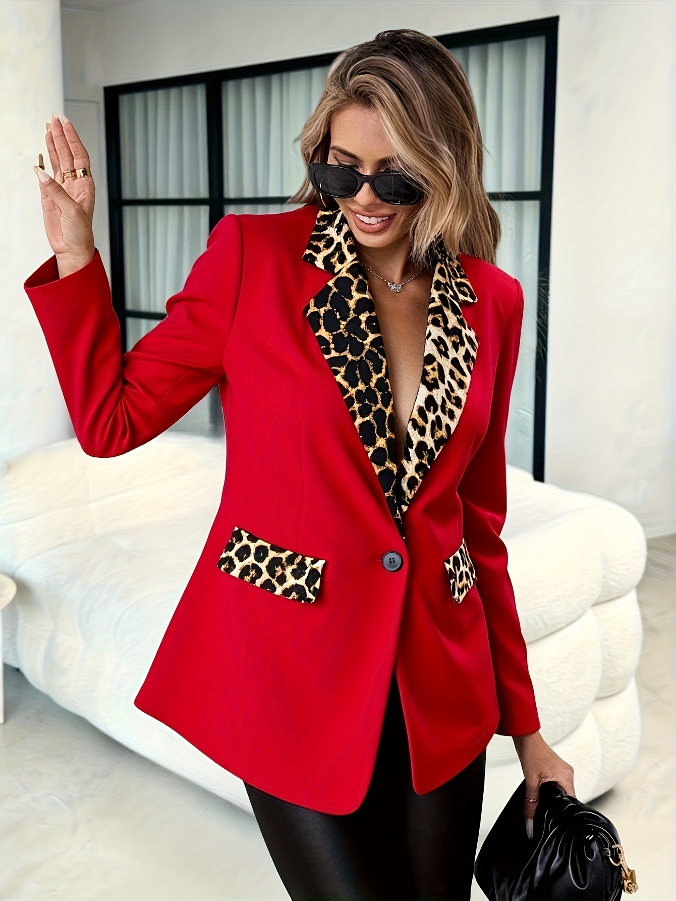 Women’s Red & Black Leopard Print Blazer Jacket – Elegant Collar & Cuff Details, Tailored Loose-Fit Single-Breasted Coat for Professional & Casual Wear, Springu002FAutumn Outerwear (No Beltu002FHardware)
