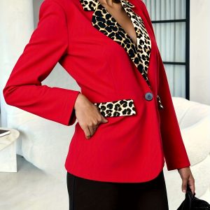 Women’s Red & Black Leopard Print Blazer Jacket – Elegant Collar & Cuff Details, Tailored Loose-Fit Single-Breasted Coat for Professional & Casual Wear, Springu002FAutumn Outerwear (No Beltu002FHardware)