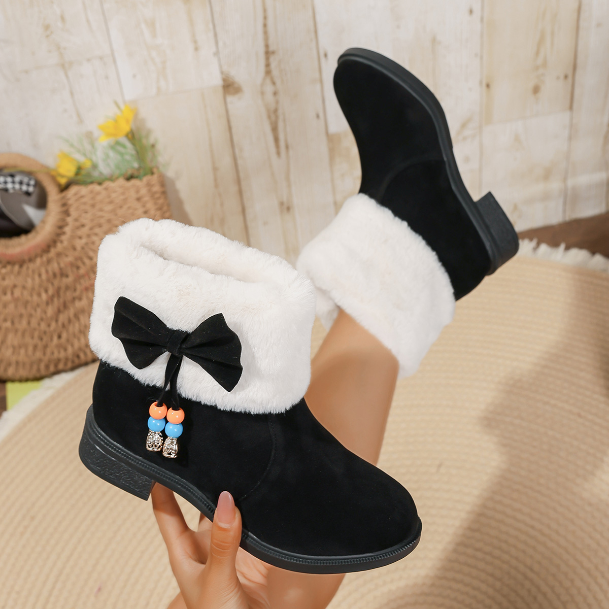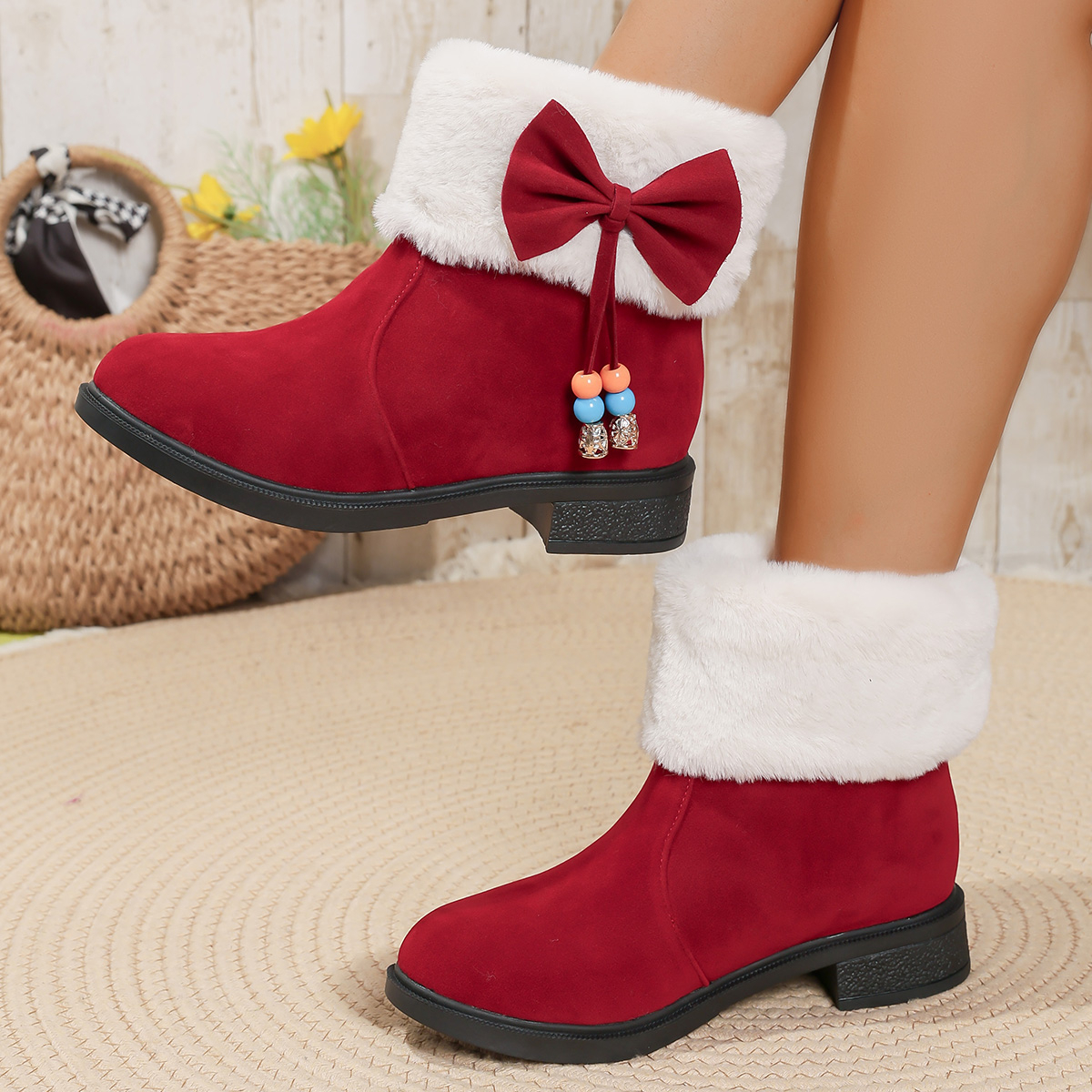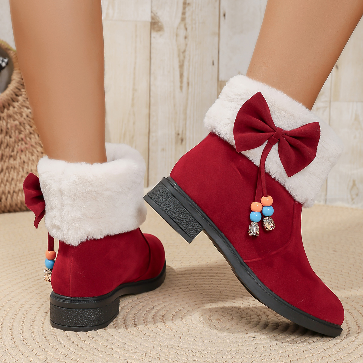Women’s Slip-On Winter Boots, Thick Cushioned Sole with Slip-Resistant Rubber Outsole, Plush Lined Interior for Warmth, Durable Traction for Cold Weather, Burgundyu002FRed Bow Adorned Bootie, Easy Slip-On Closure, Stylish Footwear for Office Wear, Everyday & Formal Outfits, Autumn and Winter Shoes for Women